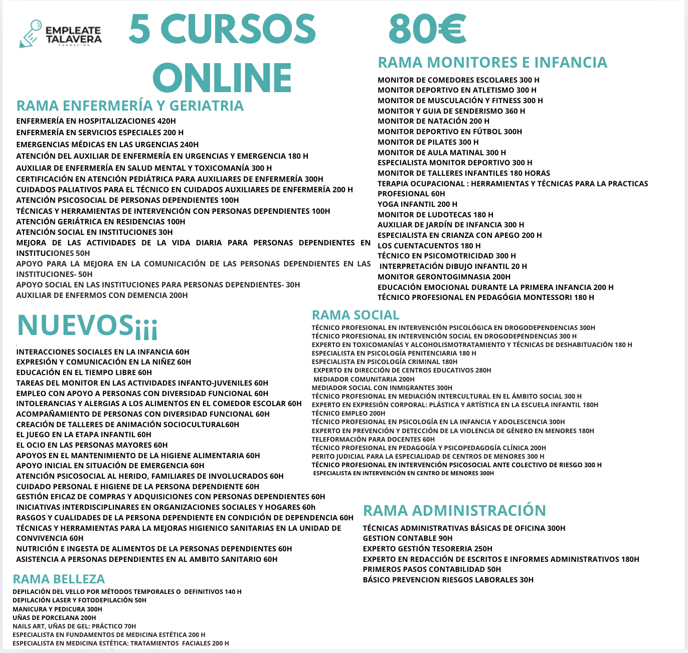 🎓 ¡APROVECHA ESTA INCREÍBLE OFERTA! 🎓 🔥 5 cursos online por solo 80€ 🔥 📚 Sin gastos adicionales Detalles de la promoción Puedes elegir y combinar los cursos que desees de entre todas las categorías disponibles. Dispones de 18 meses para completarlos, organizándote a tu ritmo. Cursos 100% online para que aprendas desde la comodidad de tu hogar. Los temarios están en formato PDF descargables 📋 Ramas disponibles ✅ Enfermería y Geriatría ✅ Monitores e Infancia ✅ Belleza ✅ Social ✅ Celadores ✅ Administración ¿ Que titulación recibo? Al finalizar los cursos online de la promoción de Empléate Talavera Formación, recibirás: 👉Un diploma acreditativo emitido por el Centro de Formación Empléate Talavera. 👉Este diploma certifica que has completado el curso satisfactoriamente y detalla la duración y los contenidos cursados. 👉Validez del diploma: 👉Estos cursos suelen estar enfocados en la formación complementaria y profesional, por lo que son ideales para incluir en tu currículum y destacar en procesos de selección. 👉Codigo Qr y cvc para comprabar la acreditación de la misma. 👉Tambíen podrá solicitar en algunas ramas, Plan acredita , acreditación de competencias con formaciones de al menos 300h, y solicitar posterior certificado de profesionalidad. 👉Ámbito de utilidad: oEstos certificados son válidos para mejorar tus habilidades y cualificación profesional. oSon ideales para acceder a determinados trabajos o mejorar tus competencias en áreas específicas. 💡 Solo pagas la matrícula, sin cargos extra. ¡Invierte en tu futuro! 🚀 ¡No esperes más! Esta oferta es válida por tiempo limitado**